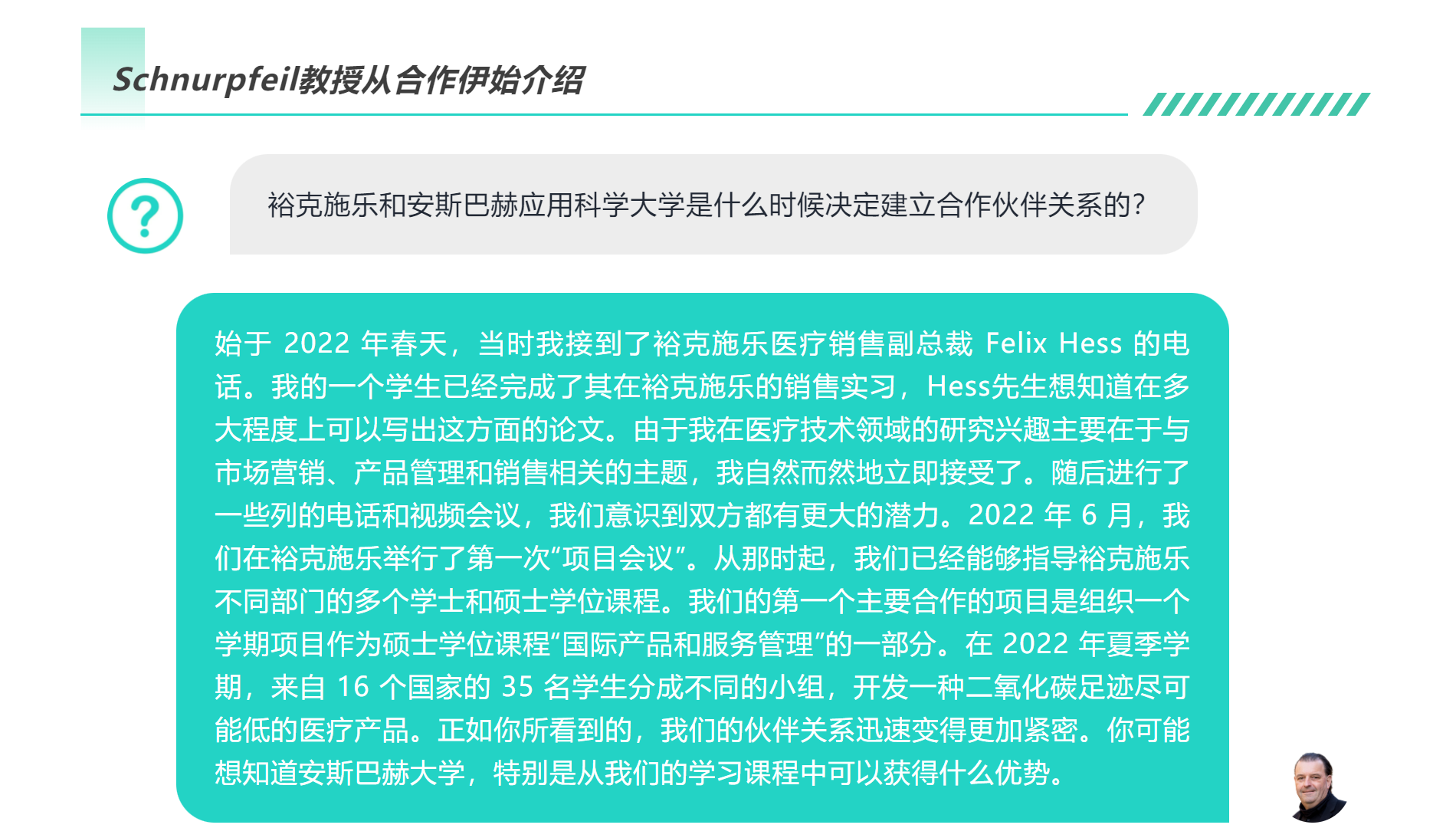 去年,裕克施乐与安斯巴赫大学-应用科学大学合作。他们最新的合作项目是裕克施乐在安斯巴赫应用科学大学的选修模块“根据门径管理流程开发医疗器械”。该公司不仅为学生提供各种实习或工作的机会,而且和其新选修的模块相关,让学生在实习之前就对现代工业环境有深入的实践见解。