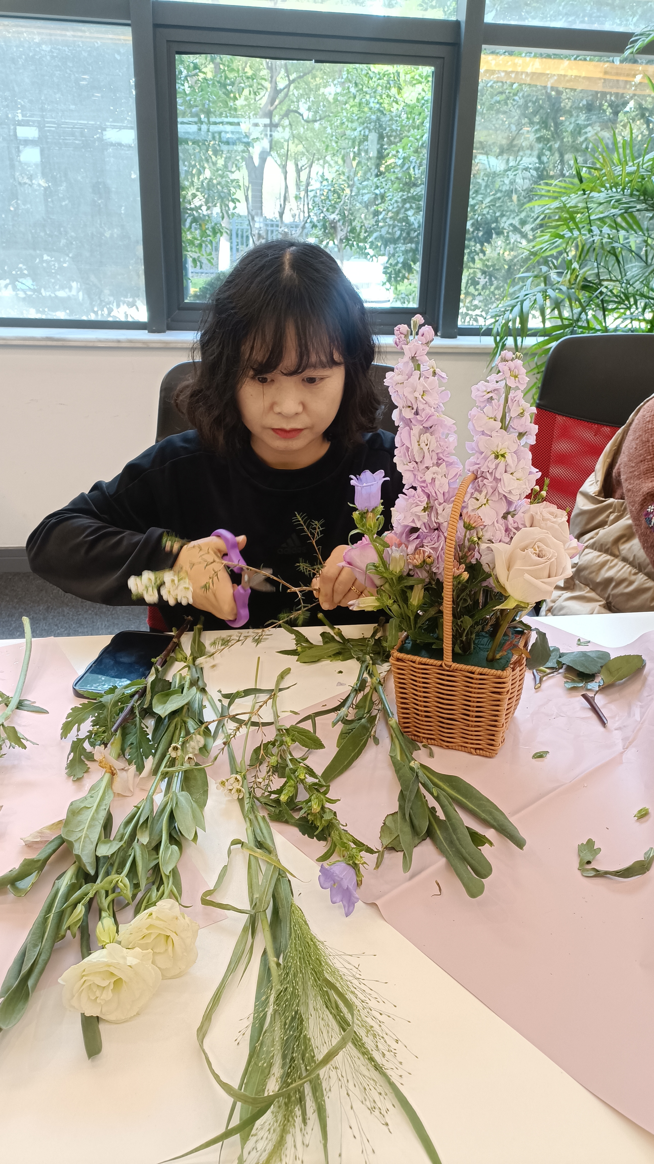 活动在轻松愉快的氛围中展开,花艺老师现场演示插花技巧,同事们在花艺老师的讲解下,结合各自手中的花材特点和审美情趣,从鲜花的取材、剪叶、构图、布局开始,不断的进行尝试和实践,忙得不亦乐乎。
